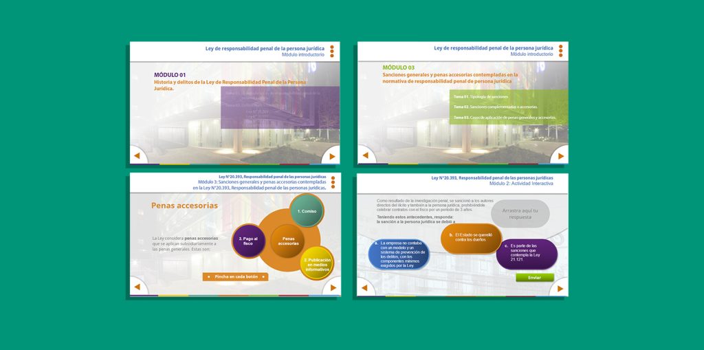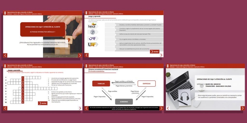 Cursos e-learning han sido realizados con equipo de diseñadores instruccionales, diseñadores gráficos, locutores y profesionales docentes experto en sus áreas.